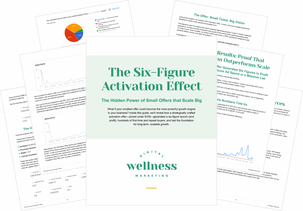 Inside The Six-Figure Activation Effect, you’ll see the data, structure, and creative strategy behind a real $77 offer that produced a six-figure-profit in the span of an 8-week launch.